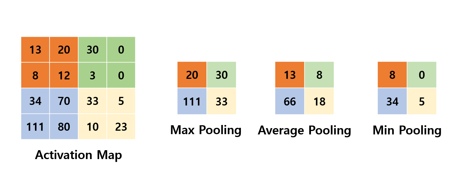 * 일반적으로 pooling의 크기와 stride의 크기를 같게 설정하여