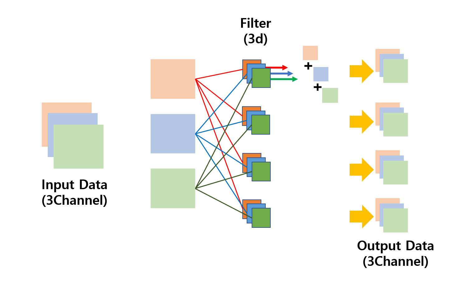 * input data와 filter의 채널의 수는 같아야하며,