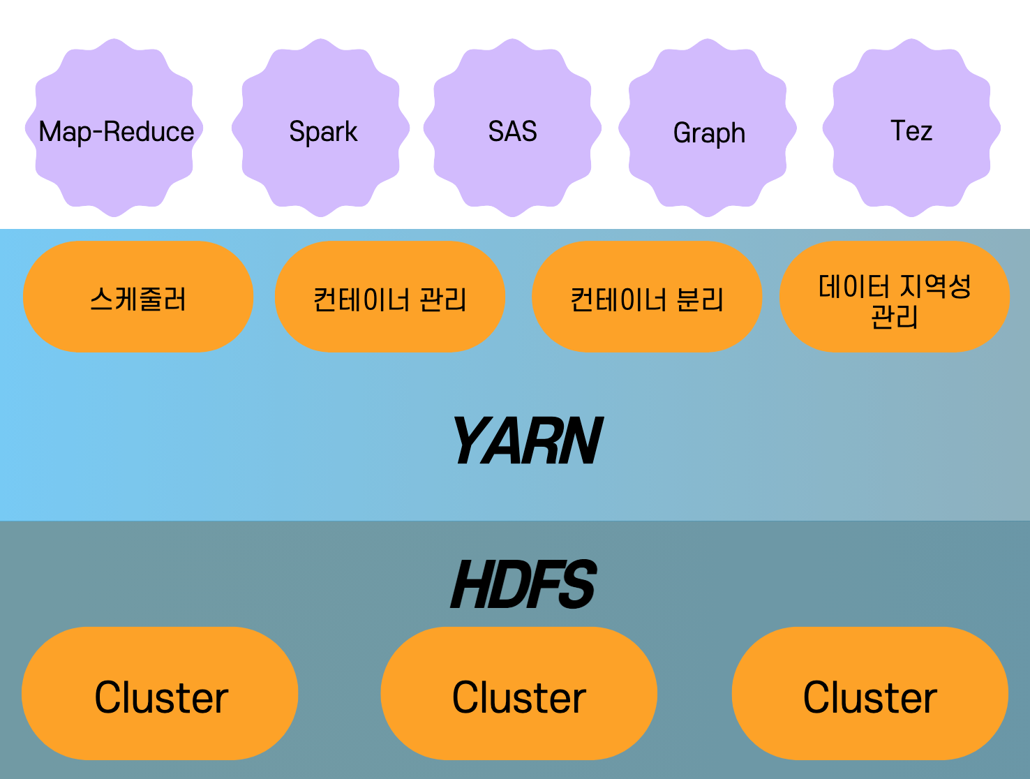요약하자면, YARN은 클러스터 전체에 계산을 분산하고 HDFS에 보관된 데이터를 확장 가능한 방식으로 처리하는 방법을
