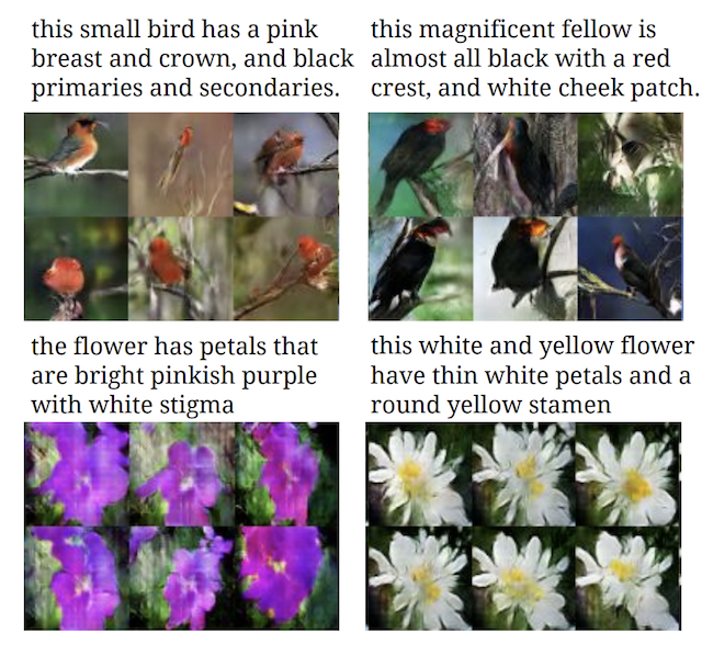 # Example of Textual Descriptions and GAN-Generated Photographs of Birds and Flowers from StackGAN (right)