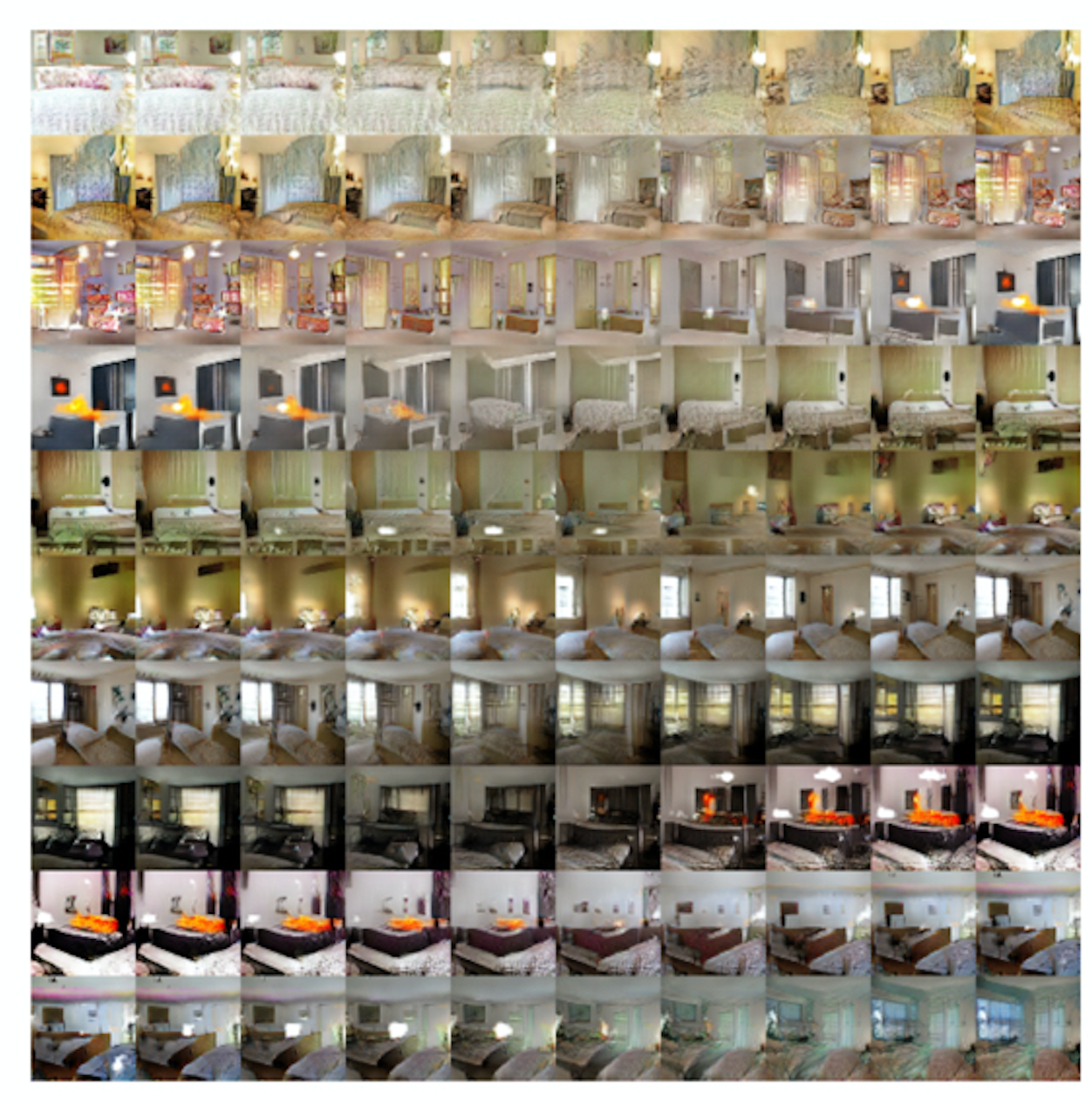 밑의 이미지는 임의변수 z를 10개 추출한 후, 그 사이에 9번 보간을 수행한 결과를 보여준다.