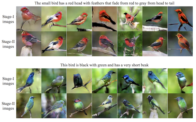 # Example of Textual Descriptions and GAN-Generated Photographs of BirdsTaken from StackGAN (left)