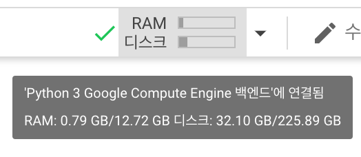 google colab의 RAM 및 DISK 용량 필자는 Google 의 Colab을 자주쓰는데,