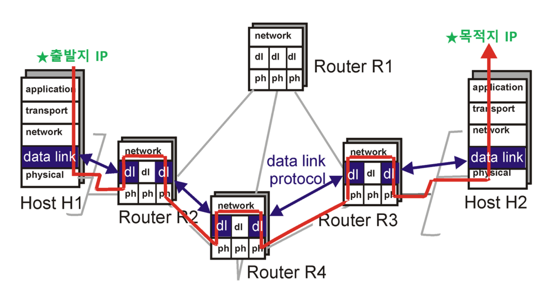 아래 그림과 같이 목적지에 도착하기 전에는 라우터간 데이터 전송은