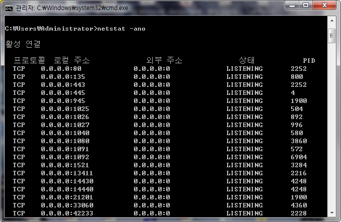 포트번호 80이 PID 2252에 의해 사용중인걸 확인할 수 있습니다..!