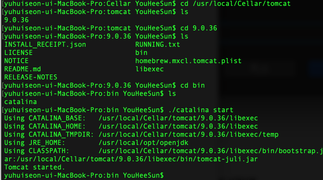 - 터미널에 cd /usr/local/Cellar 입력 후, ls 를 입력하면 tomcat 파일이 있는 것을 알 수 있다.