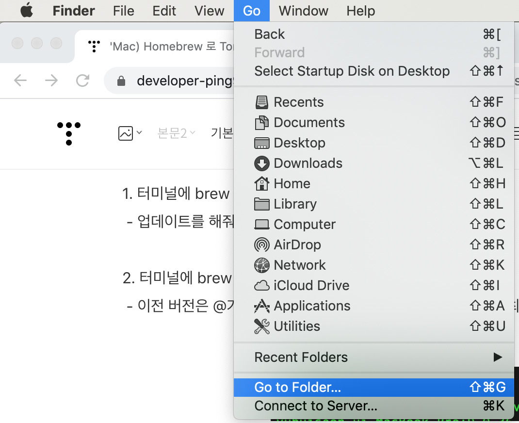 - 탐색기(Finder)의 Go -> Go to Folder 를 사용해 진입 할 수도 있다.