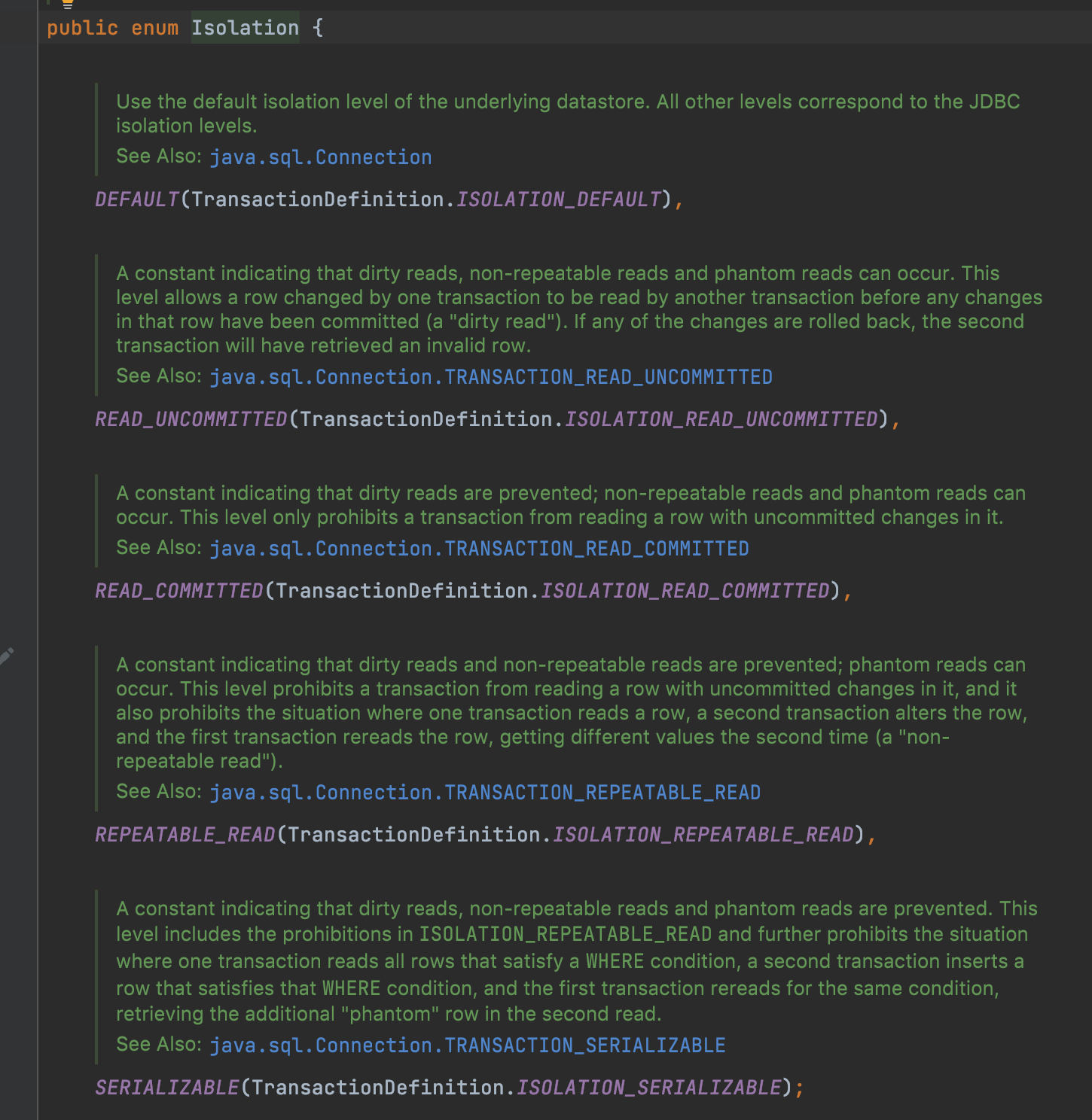 // @Transactional 은 클래스, 메소드 위에만 사용가능하다. // 클래스 스코프보다, 메소드 스코프가 우선시 된다. (둘다 달려있으면 메소드 어노테이션을 따라간다) // 클래스에 달아두면, 클래스 전체가 트랜잭션이란 의미가 아닌, 각 메소드에 @Transactional 을 붙여준 것과 같다. //Default - 설정하지 않아도 default 세팅이며, DB에 따라 Jpa가 맞춰 준다. @Transactional(isolation=Isolation.DEFAULT) //Read-uncommited @Transactional(isolation=Isolation.READ_UNCOMMITTED) //Read-commited @Transactional(isolation=Isolation.READ_COMMITTED) //Repeatable-read @Transactional(isolation=Isolation.REPEATABLE_READ) //Serializable @Transactional(isolation=Isolation.SERIALIZABLE)728x90'Back End > Spring Data JPA' 카테고리의 다른 글