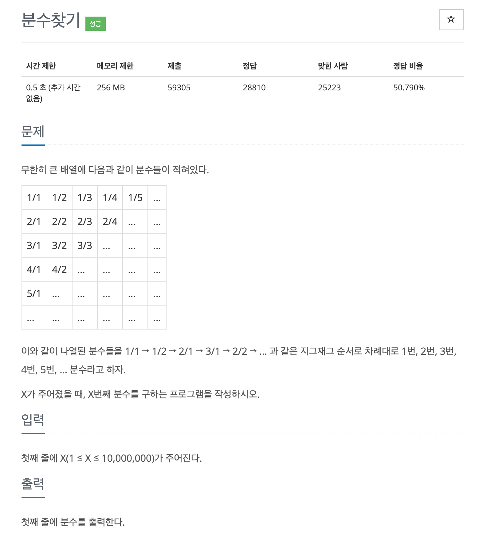 - 대각선을 기준으로 Lv 1 ~ Lv N 이라 정의하면, Lv N 의 원소의 갯수는 N개, 분모와 분자의 합은 N+1 이 된다.