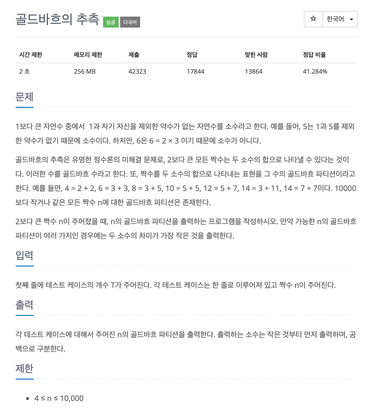 - 즉, 해당 로직으로 가장 빨리 발견하는 두 소수의 조합이 최소의 차를 가지는 골드바흐 파티션이다.