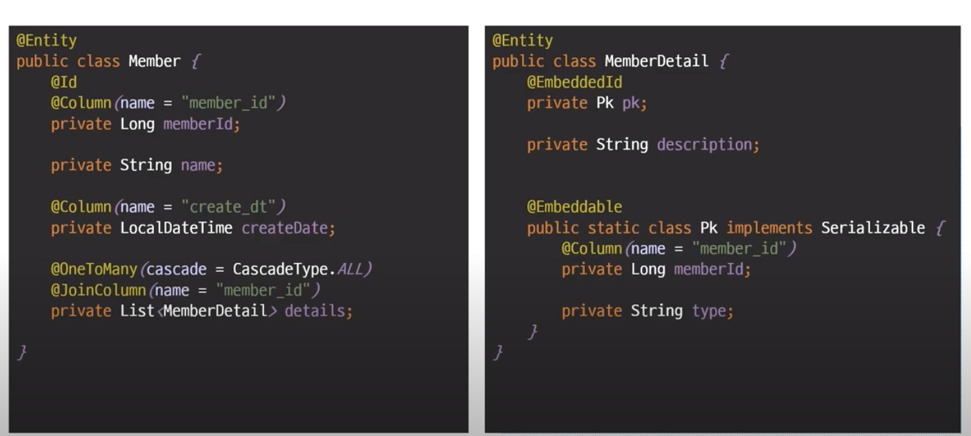 * 복합키를 외래키로 지정할때는 @JoinColumn 대신 @MapsId 사용 (연관관계 주인설정)