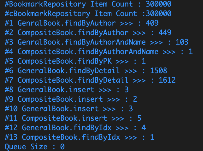 30만건짜리 테스트를 할때는 yml파일의 show_sql 옵션을 false로 지정해야 출력문의 홍수에 빠지지 않으실 것이다.더보기@DataJpaTest @Import(JpaConfig.class) public class compositeKeyTest { @Autowired BookRepository bookRepository; @Autowired cBookRepository cBookRepository; @Autowired EntityManager em; @Test void showSchema(){ } @Test void showQuery(){ List<Book> books = new ArrayList<>(); List<cBook> cBooks = new ArrayList<>(); String[] authors = {"Brian","Matt","Sun","Torr","SpiderMan"}; String[] names = {"사탕과함께사라지다","진격의노인","레프트오버","투피스","아이엠넘버포"}; //5개 for(int i=0; i<5; i++){ books.add( Book.builder().name(names[i%5]).author(authors[i%5]).detail("KK").idx(i).build() ); cBooks.add( cBook.builder().name(names[i%5]).author(authors[i%5]).detail("KK").idx(i).build() ); } bookRepository.saveAll(books); cBookRepository.saveAll(cBooks); em.flush(); em.clear(); Long startTime= System.currentTimeMillis(); System.out.println("#Start! : "+ (startTime/1000)); System.out.println("#Start! : "+ (startTime/(1000*60))); System.out.println("#Start! : "+ (startTime/(1000*60*60))); System.out.println("#BookmarkRepository Item Count : "+bookRepository.count()); em.flush(); em.clear(); System.out.println("#cBookmarkRepository Item Count :"+cBookRepository.count()); em.flush(); em.clear(); bookRepository.findByAuthor("Sun"); em.flush(); em.clear(); cBookRepository.findByAuthor("Sun"); em.flush(); em.clear(); bookRepository.findByAuthorAndName("Sun","레프트오버"); em.flush(); em.clear(); cBookRepository.findByAuthorAndName("Sun","레프트오버"); em.flush(); em.clear(); CompId pk = new CompId("Sun", "레프트오버"); em.find(cBook.class, pk); em.flush(); em.clear(); bookRepository.findByDetail("KK"); em.flush(); em.clear(); cBookRepository.findByDetail("KK"); em.flush(); em.clear(); bookRepository.findByIdx(2); em.flush(); em.clear(); cBookRepository.findByIdx(2); em.flush(); em.clear(); } @Test void test(){ List<Book> books = new ArrayList<>(); List<cBook> cBooks = new ArrayList<>(); String[] authors = {"Brian","Matt","Sun","Torr","SpiderMan"}; String[] names = {"사탕과함께사라지다","진격의노인","레프트오버","투피스","아이엠넘버포"}; //30만개 int cnt =1; for(int i=0; i<300_000; i++){ if(i%5==0){ cnt++; } books.add( Book.builder().name(names[i%5]+cnt).author(authors[i%5]).detail("KK").idx(i).build() ); cBooks.add( cBook.builder().name(names[i%5]+cnt).author(authors[i%5]).detail("KK").idx(i).build() ); } bookRepository.saveAll(books); cBookRepository.saveAll(cBooks); em.flush(); em.clear(); System.out.println("#BookmarkRepository Item Count : "+bookRepository.count()); em.flush(); em.clear(); System.out.println("#cBookmarkRepository Item Count :"+cBookRepository.count()); em.flush(); em.clear(); Long startTime; Long endTime; Long result; Long[] sum= new Long[100]; Arrays.fill(sum, 0L); Queue<Long> results= new LinkedList<>(); cnt=0; int idx=0; while(cnt<20){ //20 회 평균 idx = 0; //1 startTime= System.currentTimeMillis(); bookRepository.findByAuthor("Sun"); endTime= System.currentTimeMillis(); result = endTime-startTime; sum[idx++]+=result; em.flush(); em.clear(); //2 startTime= System.currentTimeMillis(); cBookRepository.findByAuthor("Sun"); endTime= System.currentTimeMillis(); result = endTime-startTime; sum[idx++]+=result; em.flush(); em.clear(); //3 startTime= System.currentTimeMillis(); bookRepository.findByAuthorAndName("Sun","레프트오버10"); endTime= System.currentTimeMillis(); result = endTime-startTime; sum[idx++]+=result; em.flush(); em.clear(); //4 startTime= System.currentTimeMillis(); cBookRepository.findByAuthorAndName("Sun","레프트오버10"); endTime= System.currentTimeMillis(); result = endTime-startTime; sum[idx++]+=result; em.flush(); em.clear(); //5 startTime= System.currentTimeMillis(); //엔티티 필드 ID순서(테이블필드순서)랑 복합키클래스이 필드순서가 일치해야 인덱스를 탄다.......................;;;;;; CompId pk = new CompId("레프트오버10","Sun"); em.find(cBook.class, pk); endTime= System.currentTimeMillis(); result = endTime-startTime; sum[idx++]+=result; em.flush(); em.clear(); //6 startTime= System.currentTimeMillis(); bookRepository.findByDetail("KK"); endTime= System.currentTimeMillis(); result = endTime-startTime; sum[idx++]+=result; em.flush(); em.clear(); //7 startTime= System.currentTimeMillis(); cBookRepository.findByDetail("KK"); endTime= System.currentTimeMillis(); result = endTime-startTime; sum[idx++]+=result; em.flush(); em.clear(); //8 insert 성능 Book book = Book.builder().name(names[0]).author(authors[0]).detail("KK").build(); startTime= System.currentTimeMillis(); bookRepository.save(book); em.flush(); em.clear(); endTime= System.currentTimeMillis(); result = endTime-startTime; sum[idx++]+=result; //9 cBook cbook = cBook.builder().name(names[0]).author(authors[0]).detail("KK").build(); startTime= System.currentTimeMillis(); cBookRepository.save(cbook); em.flush(); em.clear(); endTime= System.currentTimeMillis(); result = endTime-startTime; sum[idx++]+=result; //10 book = Book.builder().name(names[0]).author(authors[0]).detail("KK").idx(15_000).build(); startTime= System.currentTimeMillis(); bookRepository.save(book); em.flush(); em.clear(); endTime= System.currentTimeMillis(); result = endTime-startTime; sum[idx++]+=result; //11 cbook = cBook.builder().name(names[0]+"@").author(authors[0]).detail("KK").idx(15_000).build(); startTime= System.currentTimeMillis(); cBookRepository.save(cbook); em.flush(); em.clear(); endTime= System.currentTimeMillis(); result = endTime-startTime; sum[idx++]+=result; //12 Index 로 조회 startTime= System.currentTimeMillis(); bookRepository.findByIdx(13_000); endTime= System.currentTimeMillis(); result = endTime-startTime; sum[idx++]+=result; em.flush(); em.clear(); //13 startTime= System.currentTimeMillis(); cBookRepository.findByIdx(13_000); endTime= Syste