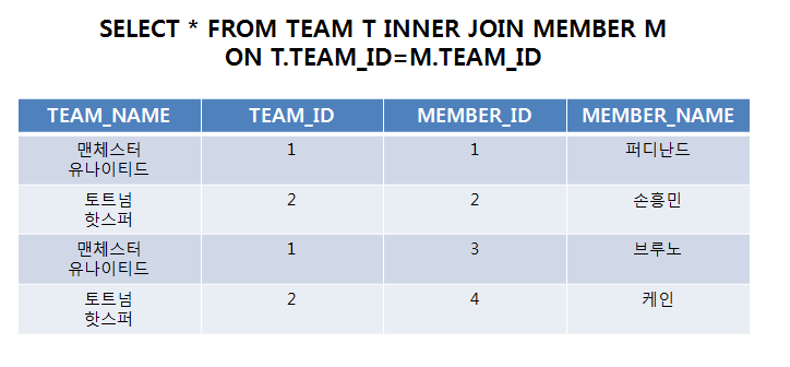 아래는 TEAM 과 MEMBER 테이블이며, DB에 데이터가 아래와 같이 저장되어있다고 하자.