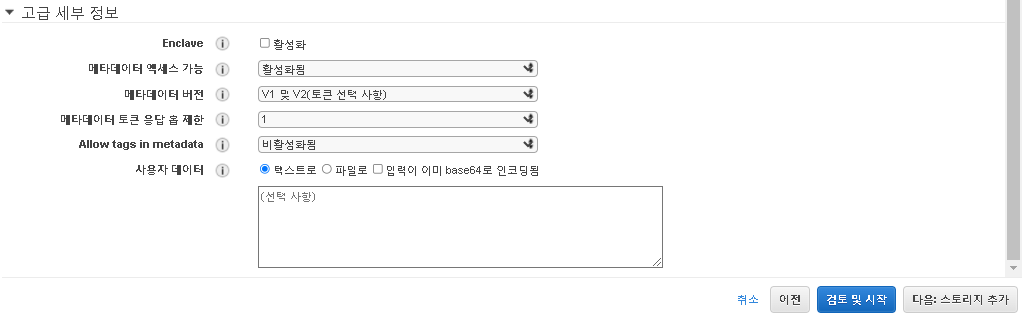 - 제일 하단의 고급 세부정보에서 UserData(사용자데이터) 부분이 쉘 스크립트 작성 부분