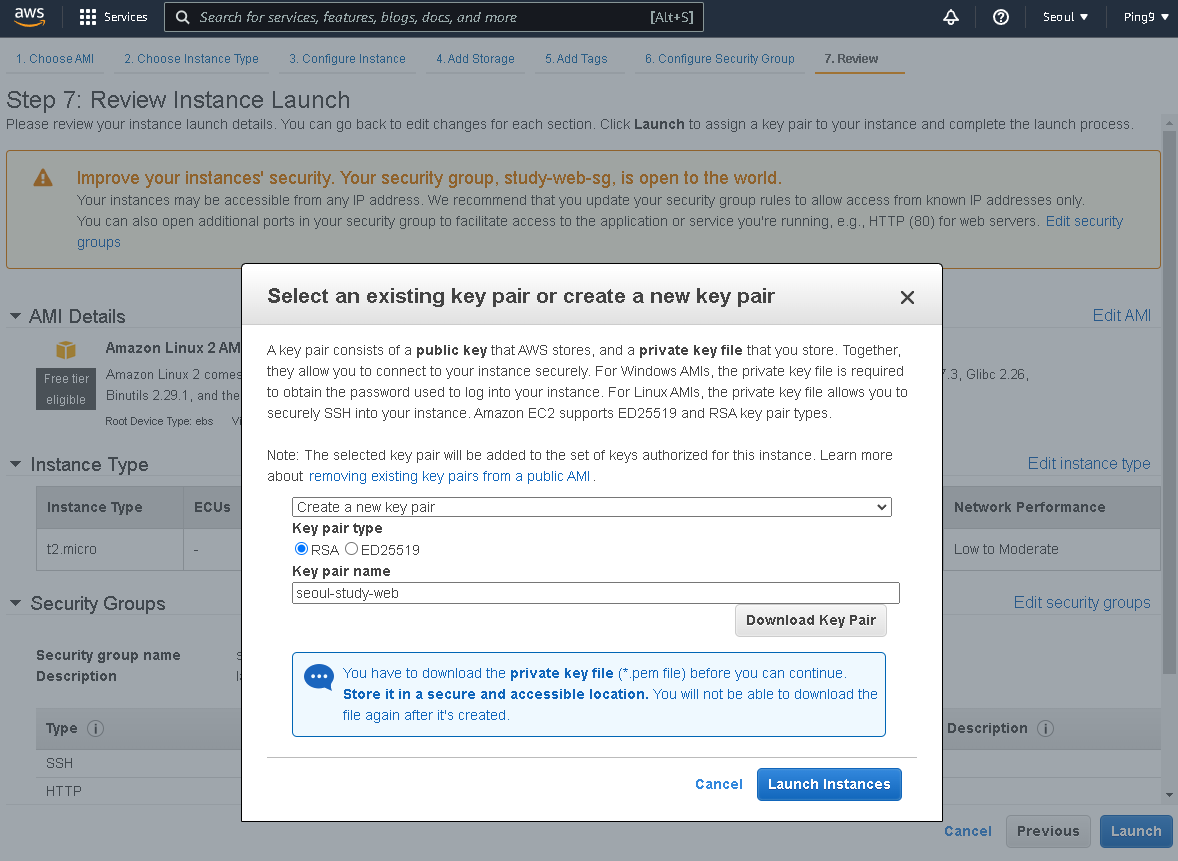 - 검토 후 Launch를 누르면 PEM키를 다운 받을 수 있다.