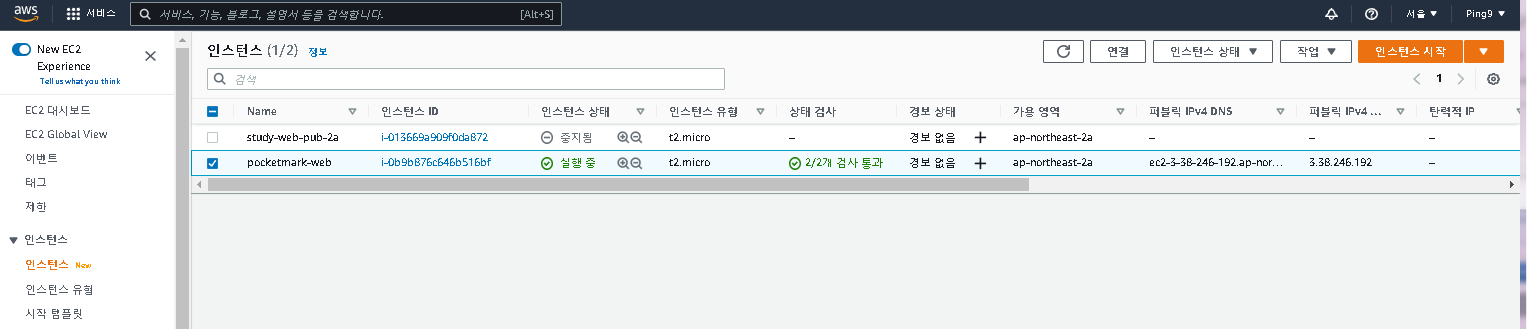 - 서비스 검색에서 EC2를 검색 후, 인스턴스->인스턴스로 들어오면 론칭한 EC2 인스턴스들을 볼 수 있다.