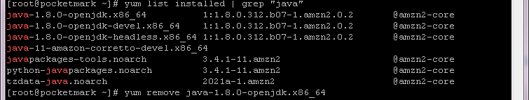 # JAVA 11 파일 다운로드 (-o 옵션을 줌으로써 jdk11.rpm 이라는 파일명으로 다운받아진다) sudo curl -L https://corretto.aws/downloads/latest/amazon-corretto-11-x64-linux-jdk.rpm -o jdk11.rpm # JAVA 11 설치 sudo yum localinstall jdk11.rpm # JAVA 버전 변경 (원하는 버전의 번호를 입력) sudo /usr/sbin/alternatives --config java # JAVA 버전 확인 java --version javac --version# 설치파일 삭제