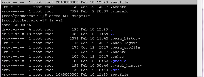 # 비어있는 파일을 만든다. (해당 파일이 만들어진 폴더는 /root 이다. 파일명은 swapfile로 되어있다.) dd if=/dev/zero of=/root/swapfile bs=1k count=2000000 conv=excl # 만든 빈 파일에 권한 설정을 해준다. (아무나 수정 못하게끔!!) chmod 600 /root/swapfile # 만든 빈 파일을 스왑파일로 설정한다. mkswap /root/swapfile # 스왑파일을 활성화 한다. swapon /root/swapfile