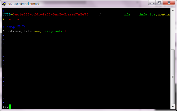 sudo vi /etc/fstab/root/swapfile swap swap auto 0 0 을 추가 해준다.