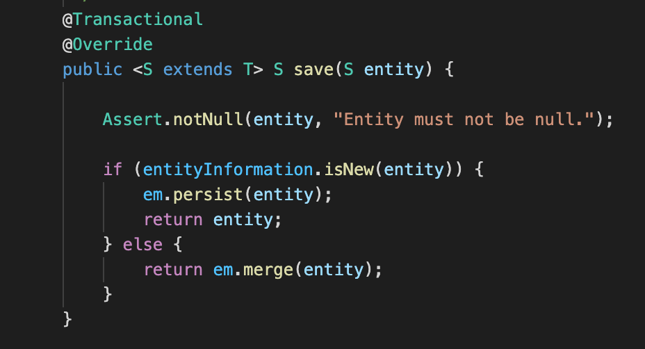 save() 메서드의 내부 코드를 보면 entityInformation.isNew(이하 isNew) 로 persist와 merge로 분기함.
