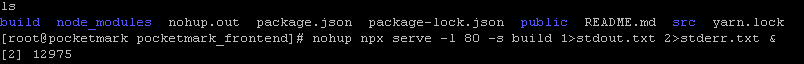 nohup npx serve -l 80 -s build 1>stdout.txt 2>stderr.txt &