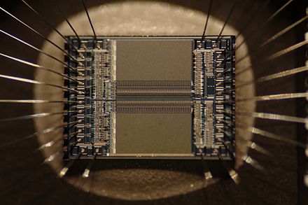 EPROM 메모리 집적회로 집적 회로(集積回路, 영어: Integrated Circuit) 또는 모놀리식 집적회로, 칩, 마이크로칩, IC는 반도체에 만든 전자회로의 집합을 말한다. 집적회로는 여러 독립된 요소를 집적해서 하나의 칩으로 만든 것인데, 각각의 트랜지스터 칩을 이용해서 회로로 만들 때 보다 훨씬 작게 만들 수 있다. 집적회로는 손톱수준의 크기에 수십억 개의 트랜지스터나 다른 전자부품이 들어갈 수 있을 정도로 조밀하게 만들 수 있다.