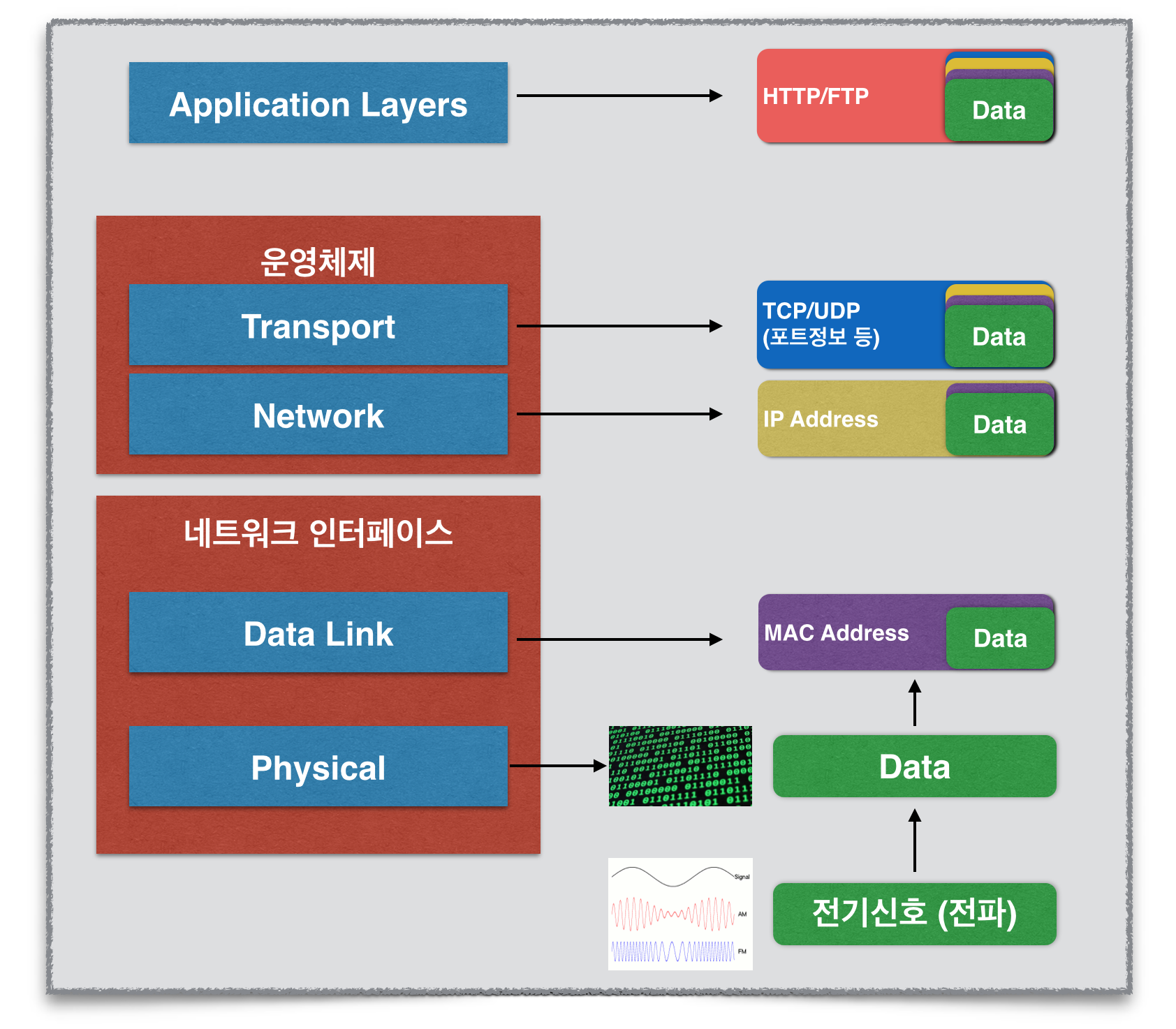 흐름의 이해를 돕기 위해 간략히 표현한 것이며, 실제로는 더 다양하다.OSI 7 Layer & TCP/IP 모델 설명글 보러가기