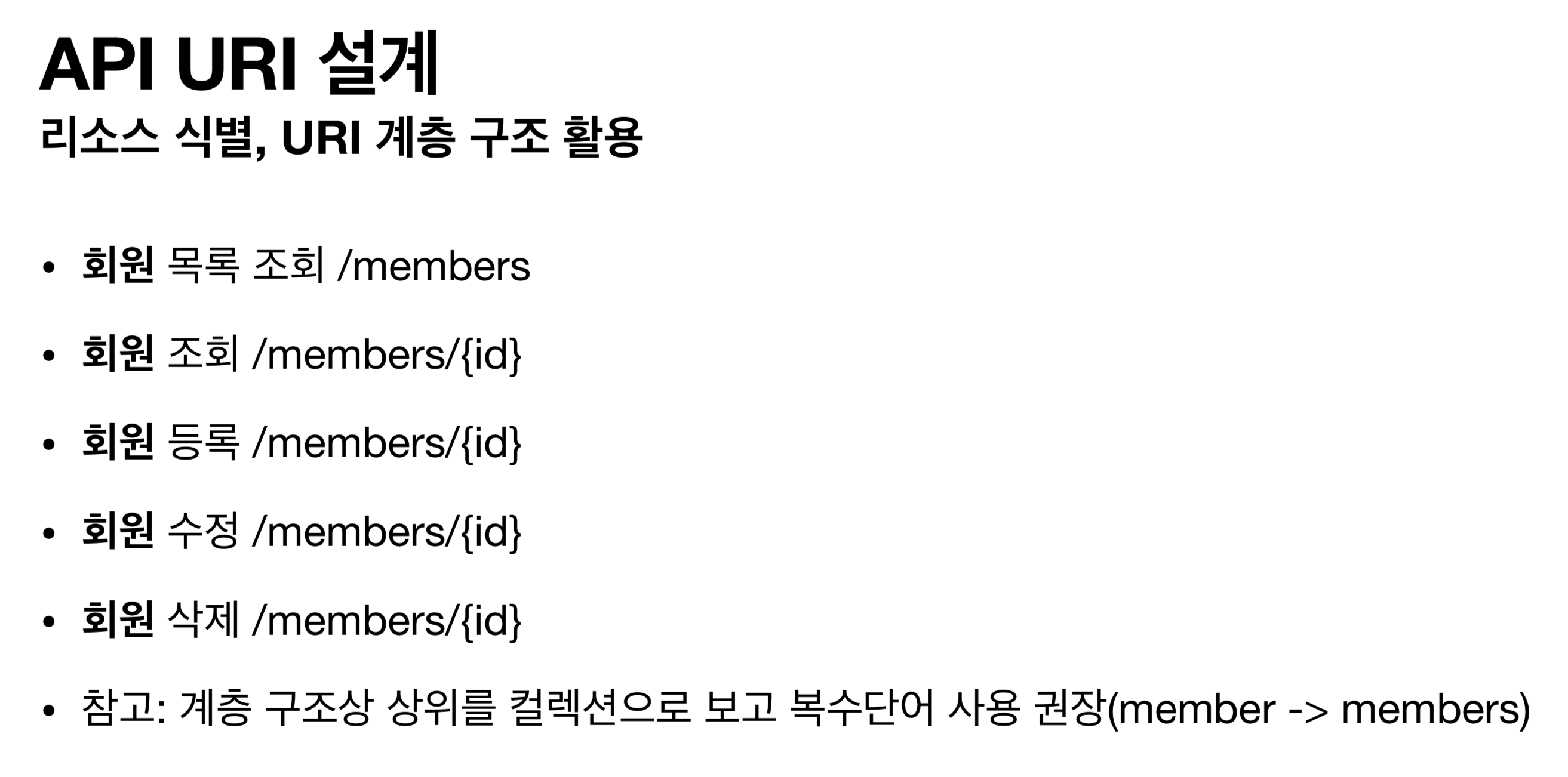 ex) /members/new, /members/edit, /members/delete, /members/start-delivery참고하면 좋은 URI 설계 개념