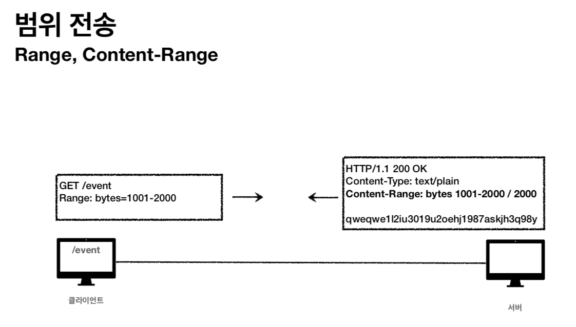 > 큰 리소스를 전송하는 도중 커넥션이 끊겼을 때, 범위전송을 사용할 수 있다.