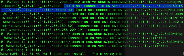 Failed to fetch http://eu-west-1.ec2.archive.ubuntu.com/ubuntu/pool/universe/a/autogen/libopts25_5.18.12-4_amd64.deb Could not connect to eu-west-1.ec2.archive.ubuntu.com:80 (54.229.116.227), connection timed out Could not connect to eu-west-1.ec2.archive.ubuntu.com:80 (54.229.225.193), connection timed out Could not connect to eu-west-1.ec2.archive.ubuntu.com:80 (54.246.214.20), connection timed out Could not connect to eu-west-1.ec2.archive.ubuntu.com:80 (34.241.117.189), connection timed out Could not connect to eu-west-1.ec2.archive.ubuntu.com:80 (34.253.189.82), connection timed out Could not connect to eu-west-1.ec2.archive.ubuntu.com:80 (34.253.229.19), connection timed out