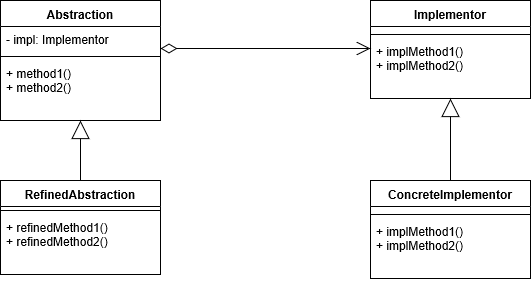 두개의 다른 계층(하나는 추상, 하나는 구현인 서로다른 계층)의 커플링을 약화시키며 협력은 가능하도록 하는 패턴