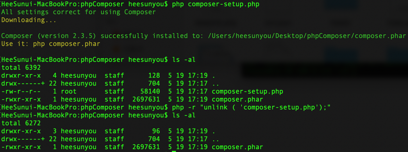 위 과정이 끝나면 `composer.phar` 파일만 남는다. 아래의 커맨드를 입력하여 composer 를 global 로 사용할 수 있게 한다.