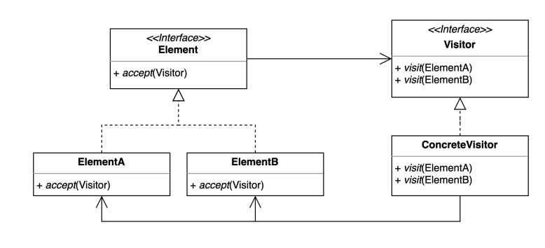 ConcreteVisitor 는 Desktop, Pad, Watch 이다.// Visitor Interface public interface Device { void render(LoginView loginView); void render(HomeView homeView); } // Concreate Visitor public class Desktop implements Device { @Override public void render(LoginView loginView) { System.out.println("LoginView rendered in Desktop"); } @Override public void render(HomeView homeView) { System.out.println("HomeView rendered in Desktop"); } } // Element Interface public interface View { void accept(Device device); } // Concreate Element public class LoginView implements View { @Override public void accept(Device device) { device.render(this); } }새로운 Device 가 생성되어도 View 에선 코드 수정이 일어나지 않는다.