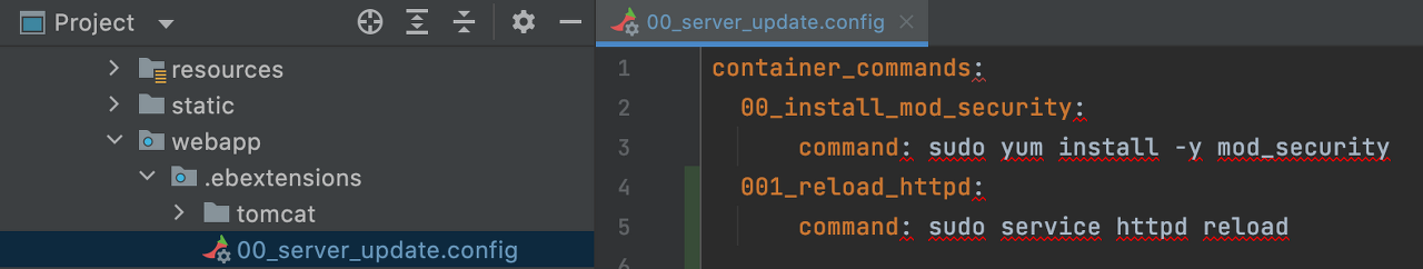 <plugin> <artifactId>maven-war-plugin</artifactId> <configuration> <webResources> <resource> <directory> {빌드되기전 ebextension 을 포함한 디렉토리 경로} </directory> <targetPath>.ebextensions</targetPath> <filtering>true</filtering> </resource> </webResources> </configuration> </plugin>실행되어야 할 ebextension 커맨드 작성하기