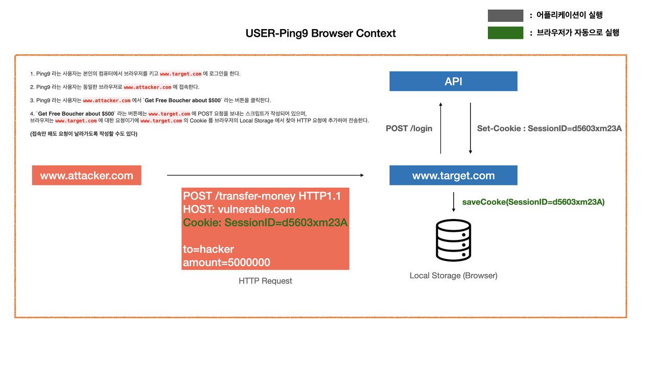 (취약사이트에 피싱사이트 링크가 삽입된 글을 올린다거나 등)Ping9 브라우저에서는 현재 브라우저에 있는 도메인과 다른 도메인에 대해 요청을 할 때 쿠키 값을 포함시킬 수 있기에 `attacker.com` 이라는 사이트에서 `target.com` 으로 요청을 생성하기만 하면 Ping9 브라우저는 친절하게도 `target.com` 의 쿠키값을 request 에 추가하여 보내주게 된다.