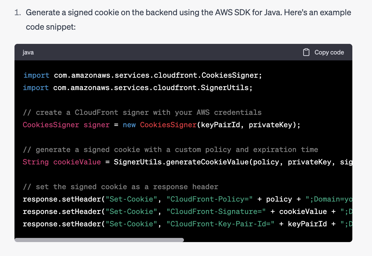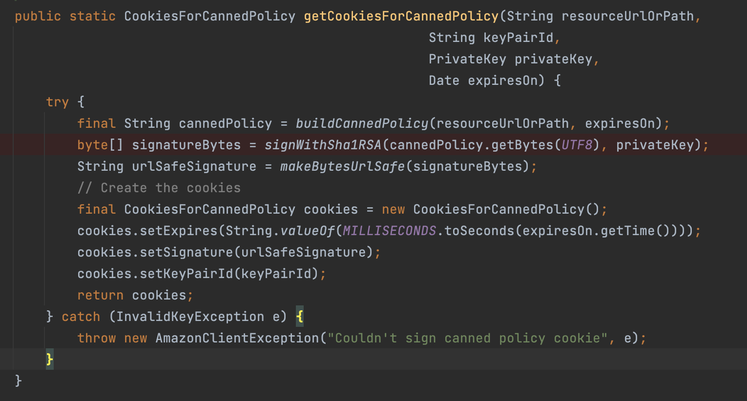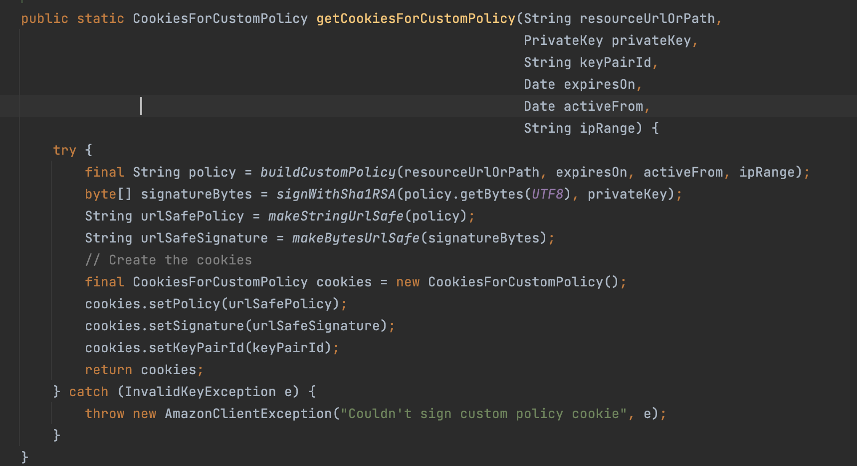 CloudFrontCookieSigner.getCookiesForCannedPolicy() 예제를 따라해보면 동작하긴 한다.