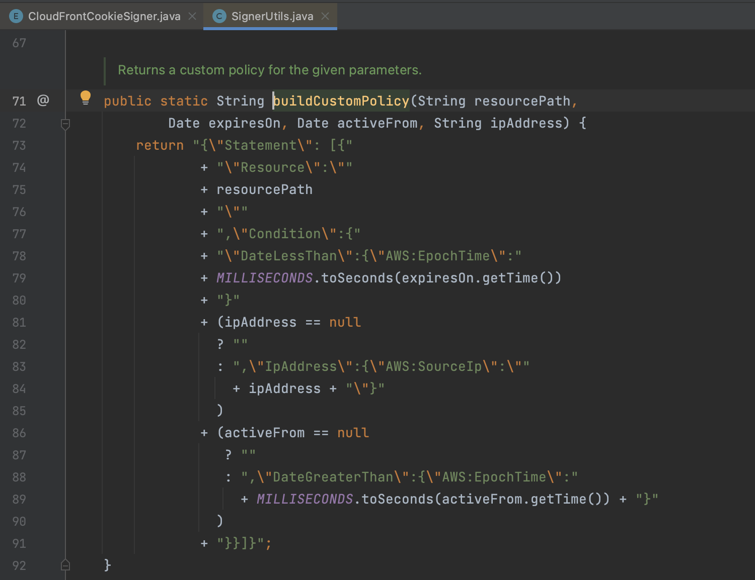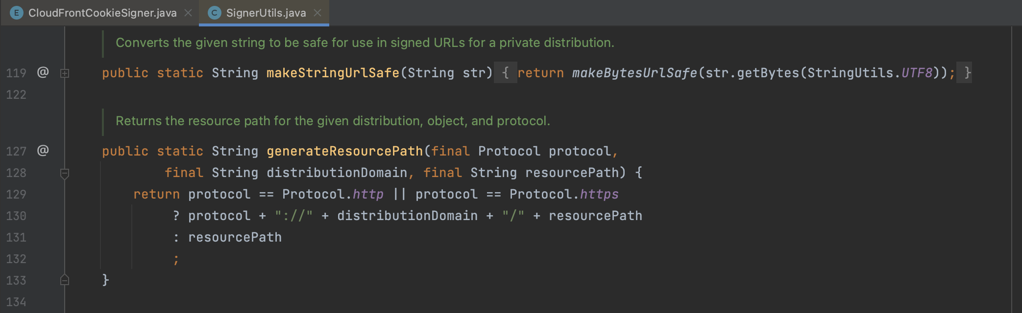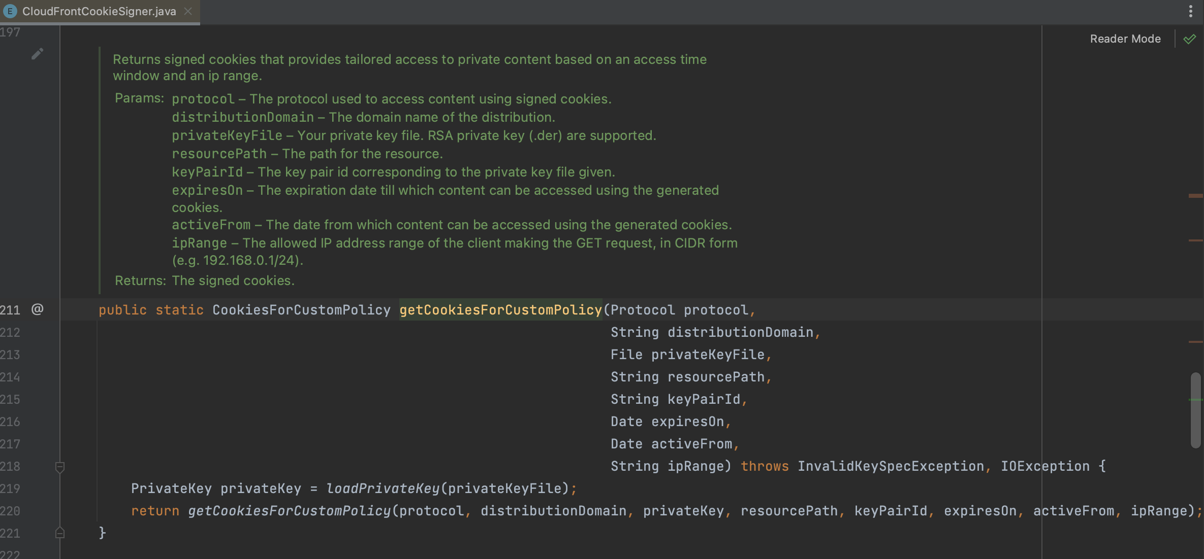 CloudFrontCookieSigner.getCookiesForCannedPolicy() 예제를 따라해보면 동작하긴 한다.