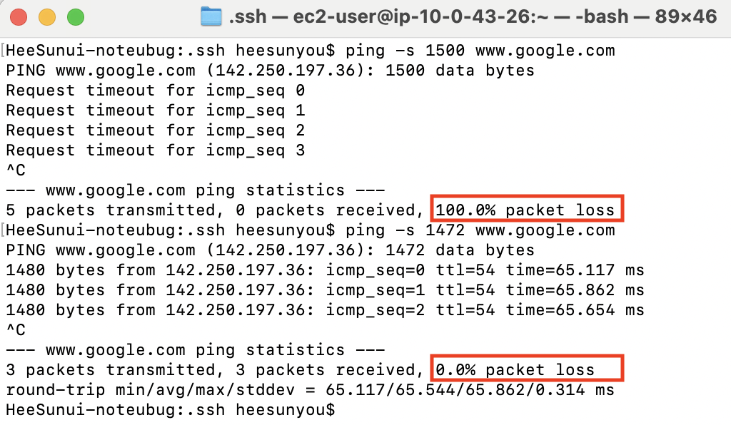 참고로 ping의 경우 IP 헤더(20바이트) + ICMP 헤더(8바이트)로 요청을 보내는 것이기 때문에 MSS는 1472 까지 가능하다.