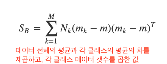 # S(B) : 클래스 간 산점행렬(Between Scatter Matrix), 클래스 간의 산점도를 나타내는 지표