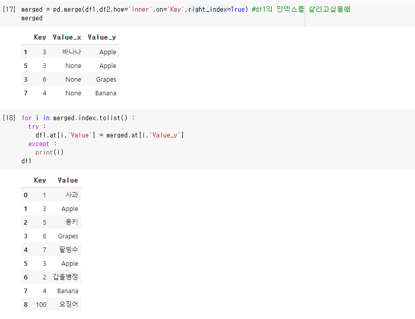 Pandas - 조건에 따라 각각 다른 값 넣기, 서로다른 데이터프레임 Key 기준으로 Merge(Join) 하기, 특정 index에 접근하여 값 바꾸기