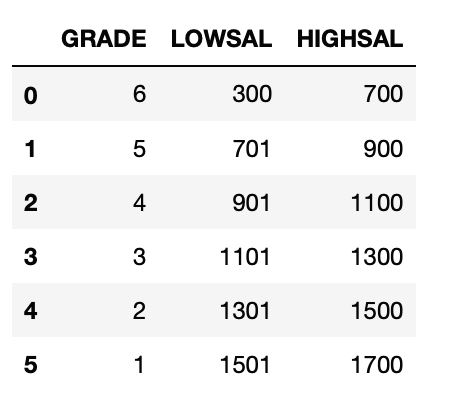 WHERE A.SAL BETWEEN B.LOWSAL AND B.HIGHSAL